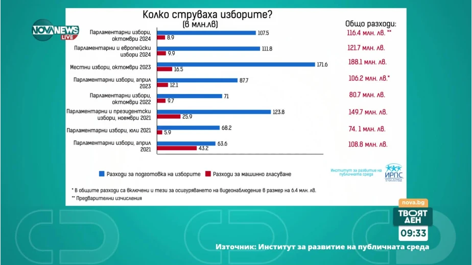 От април 2021 г. до момента предсрочните изборите са ни стрували почти 950 млн. лв. „Данните включват цената за администриране на изборите. Това са всичките средства, които даваме за администриране на вотовете, обновяване на софтуерите, разпечатването на хартиени бюлетини и възнагражденията на изборната администрация. Не се включват разходи, които правят самите партии“, заяви експертът в Института за развитие на публичната среда Лилиан Никифорова в ефира на предаването "Твоят ден" по NOVA NEWS.