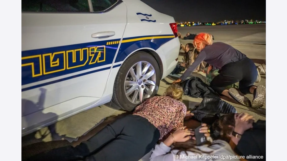 "Германският канцлер Олаф Шолц бе принуден да легне на писта на израелското летище "Бен Гурион" заради атака на палестинската терористична групировка Хамас срещу Тел Авив", написа списание "Политико".
