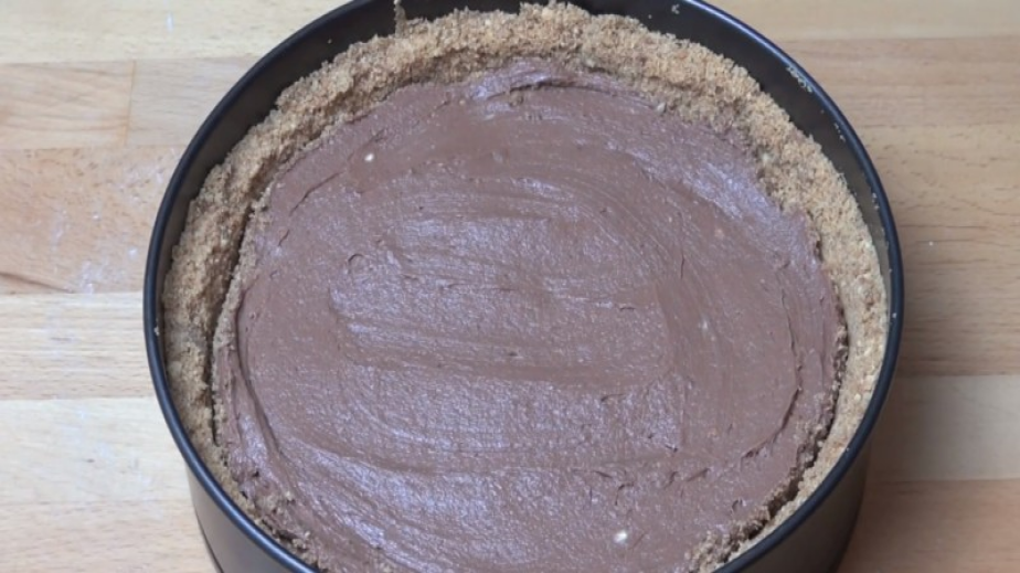 След като приключите с изравняването, изсипете отгоре сместа от сиренето и течния шоколад. Разпределете равномерно по цялата повърхност. Оставете за няколко минути.
