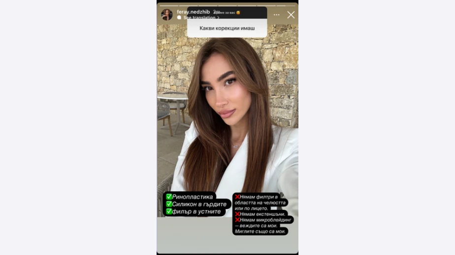 Ферай заяви, че когато мине възстановителният период, ще даде отзиви на последователите си относно хирург, болница и т.н. Засега не искала да избързва със заключенията, но като цяло се чувствала добре. Крехката брюнетка, която не спря да се тъпче с луканка в предаването, сподели още, че тежи едва 44 кг и е висока 159 см. Както стана ясно, тя много обича да яде, но пък мазнините не ѝ се лепят, защото тренира. От 3-годишна се занимава със спорт.