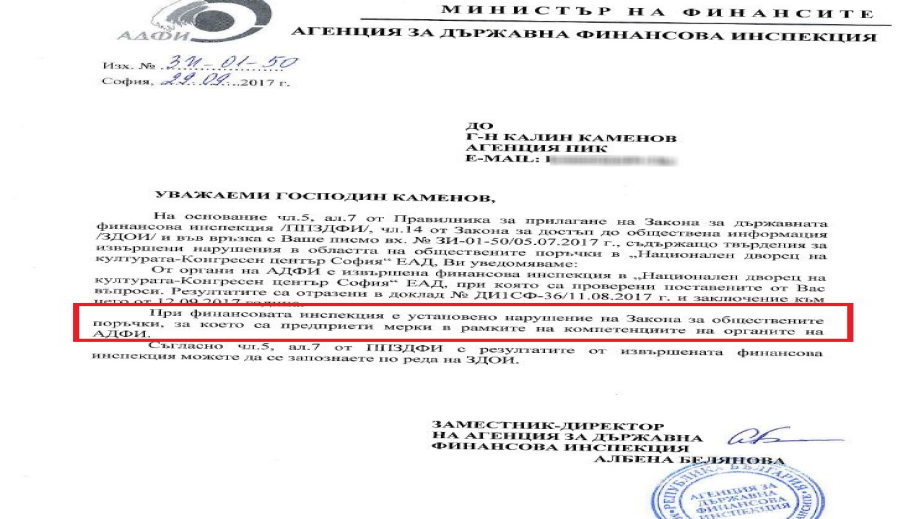 Агенцията за държавен финансов надзор закова уволнения директор на НДК Мирослав Боршош! Има нарушения при изграждането на надписа „София“, пише ПИК. Това получихме като документ от проверяващите.