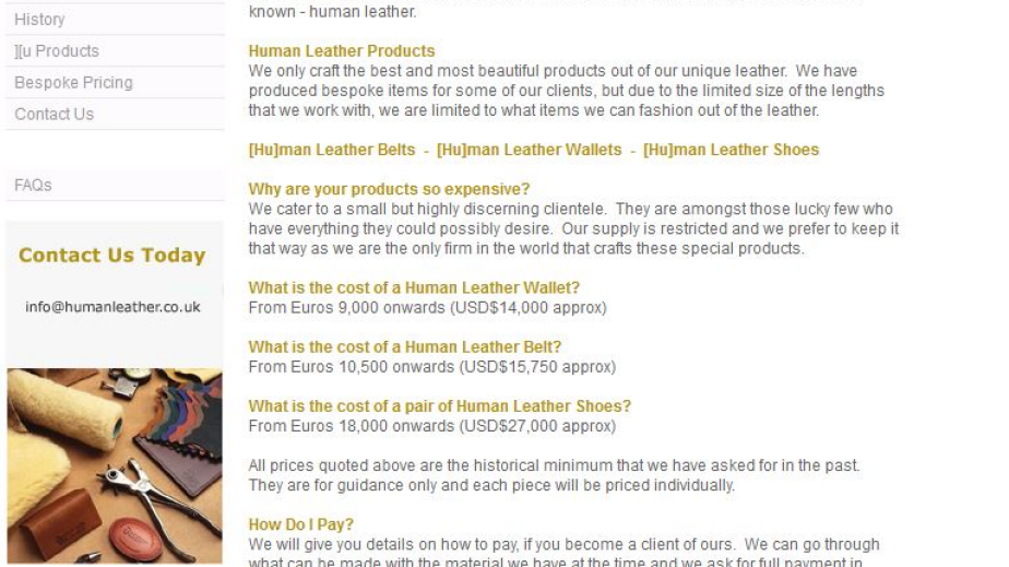 Британската компания Human Leather предлага скъпи изделия от натурална (истинска) човешка кожа. Фирмата работи в настоящия режим на демокрация напълно легално вече осма година, но без особено да се рекламира. Тя продава чрез интернет сайт различни вещи, изделия и аксесоари, изготвени от човешка кожа, пише "Руская Весна", предава БЛИЦ.