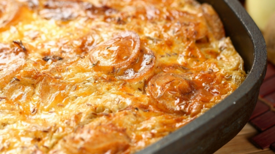 запържете в масло няколко скълцани скилидки чесън. Почистете картофите и ги нарежете на филии.Започнете да ги редите в тавичка, като ги застъпвате, на редове и поръсете с чесъна между тях. Поръсете със сол и черен пипер.Разбийте яйцата с млякото и добавете настъргания кашкавал. Залейте върху картофите и сложете да се пече в умерено загряна фурна.Поднесете ястието в тавичката.