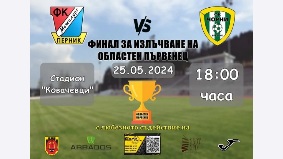 В събота от 18:00 часа на стадион "Димитровец " в село Ковачевци един срещу друг ще се изправят победителите на двете "А" областни футболни групи в област Перник - ФК „Металург“ - Перник и ФК "Чорни 1920" - Брезник. Двата отбора спечелиха първите места в групите си и сега ще спорят за купата на областен първенец.