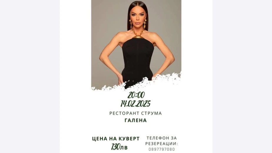Една от най-хитовите изпълнителки на фолка Галена ще пее в Перник за празника на влюбените 14 февруари. Участието ѝ ще започне в 20.00 ч., в ресторант „Струма“.