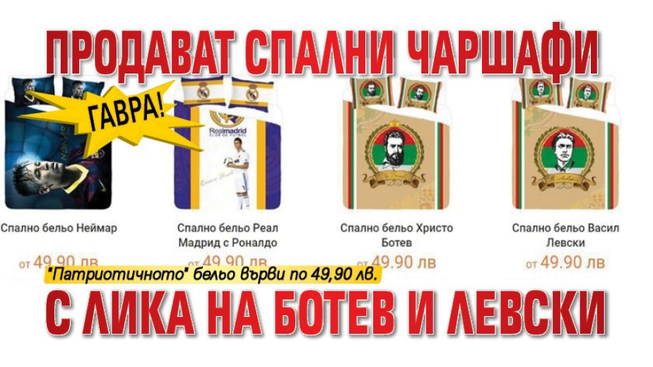 Спалното бельо не е особено евтино - за да спиш с великите ни национални герои се искат...49,90 лв. За толкова се предлагат чаршафите с лика на Апостола и автора на "Хаджи Димитър". Комплектите се предлагат редом до тези с щампата на Роналдо и Неймар.