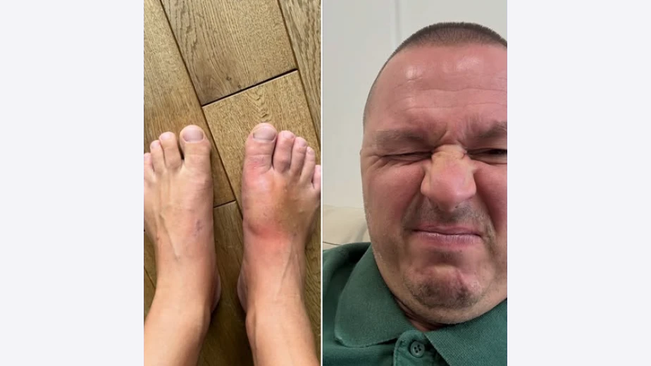 На публикуваната снимка кракът му изглежда сериозно пострадал – подут и посинял, а фенове коментираха шеговито, че е „като след турне с AC/DC“.