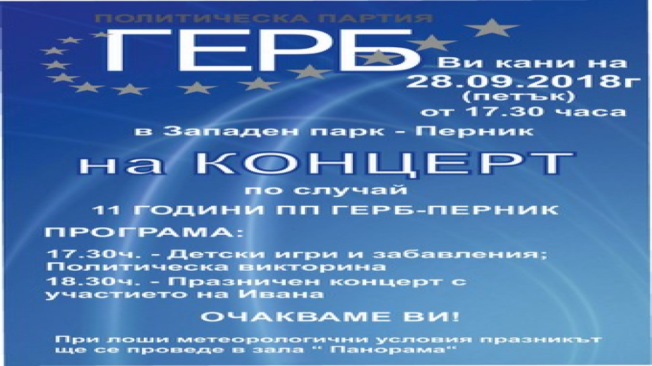 Очакваме Ви на 28 септември (петък) в Западен парк-Перник. Началото ще бъде дадено в 16:30 ч. с политическа викторина и много изненади.