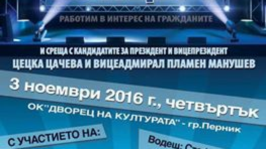 ПП ГЕРБ-Перник кани всички членове и симпатизанти на партията на концерт и среща с кандидатите за президент и вицепрезидент Цецка Цачева и вицеадмирал Пламен Манушев и председателя на предизборния щаб на ПП ГЕРБ и зам.-председател на политическата сила Цветан Цветанов.