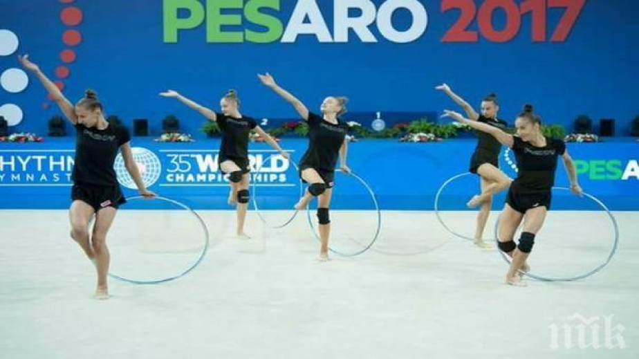 Отборът ни в състав Симона Дянкова, Мадлен Радуканова, Теодора Александрова, Лаура Траатс и Елена Бинева получи 18.650 за изпълнението си с пет обръча и 18.300 за композицията с топки и обръчи. Сборът от 36.950 точки отреди на родните грации второто място в класирането. Нашите гимнастички бяха изпреварени единствено от защитаващият титлата си ансамбъл на Русия, който приключи със сбор 37.700. Бронзовите медали са за отбора на Япония със сбор 36.650.