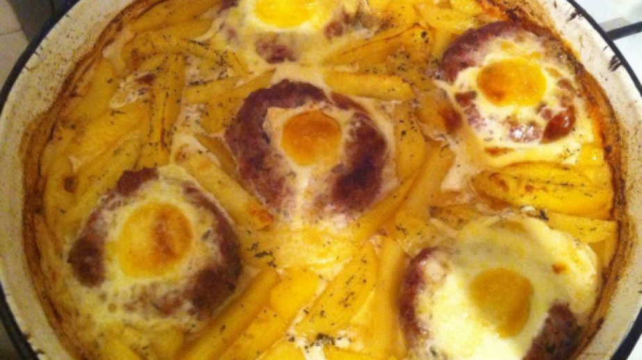 Нарязваме си картофа и слагаме в тавата, отгоре подреждаме гнездата и поливаме с олио и добавяме водата.