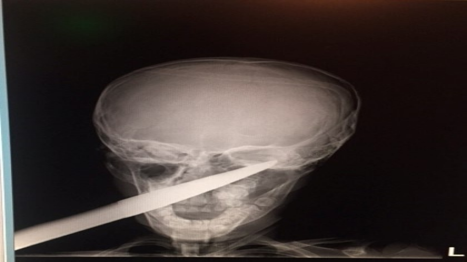 По думите на родителите, детето паднало върху инструмента, докато си играело в градината. Ръждясалото острие минало през цялата буза и опряло в черепа зад окото. "Още няколко милиметра и изходът щеше да е фатален", коментират дежурните лекари.