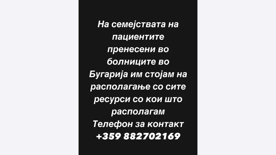 „На семействата на пациентите, настанени в българските болници предлагам помощ и съдействие от каквато имат нужда“. Благица преживява изключително тежко загубата и тежките наранявания на толкова млади хора и се надява в РСМ близки на настанените на лечение да прочетат обръщението й. Във Фейсбук тя е посочила своя телефон както и е готова да предостави телефоните и на други граждани на РСМ за оказване на помощ. България бе първата страна, подала ръка и приела на лечение пострадали от тежката трагедия, от българското Министерство на здравеопазването има дежурен експерт за роднините на пострадалите за информация за лечението им на телефон 02 80 50 30.