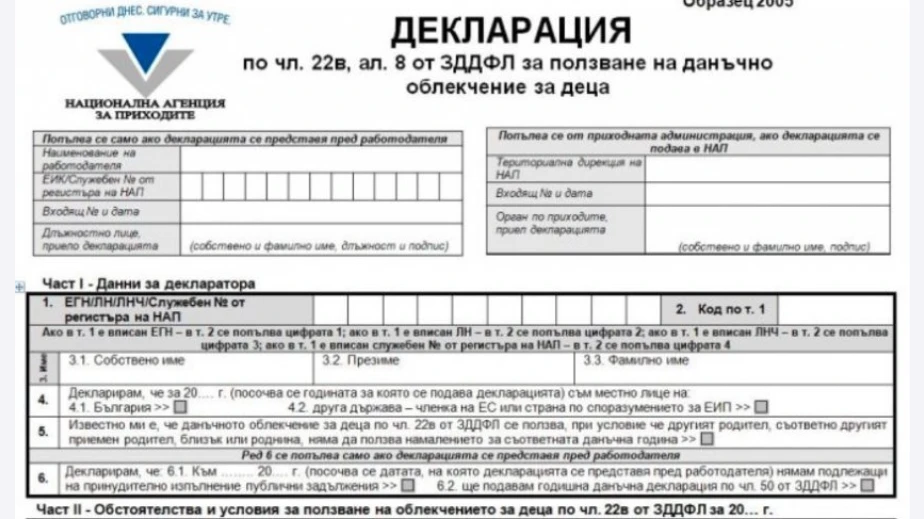 Декларацията за ползване на данъчните облекчения за деца по чл. 22в, ал. 8 от ЗДДФЛ и декларация за ползване на данъчните облекчения за деца с увреждания по чл. 22г, ал. 7 от ЗДДФЛ са публикувани на сайта на приходната агенция.