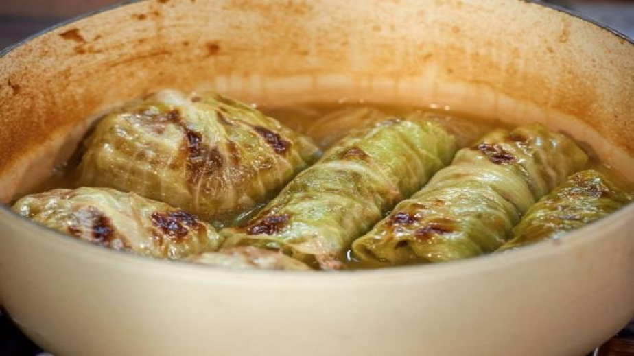 Приготвят се 12 едри листа зеле, като се изрязва дебелата част в основата на всеки лист. Бланшират се във вряща, подкиселена с оцет вода до леко омекване.