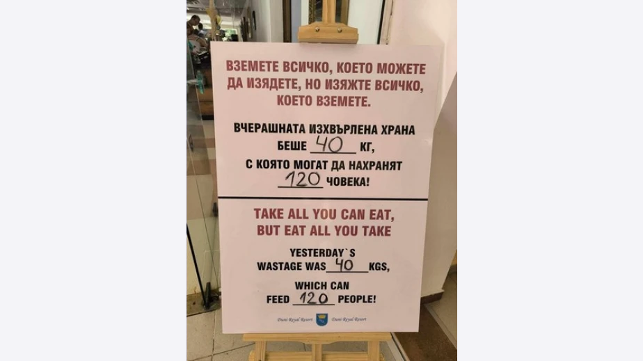 "Вземете всичко, което можете да изядете, но и изяжте всичко, което вземете", гласи надписът, който подчертава, че от предния ден са изхвърлени 40 кг храна, с която биха се заситили 120 гладни.