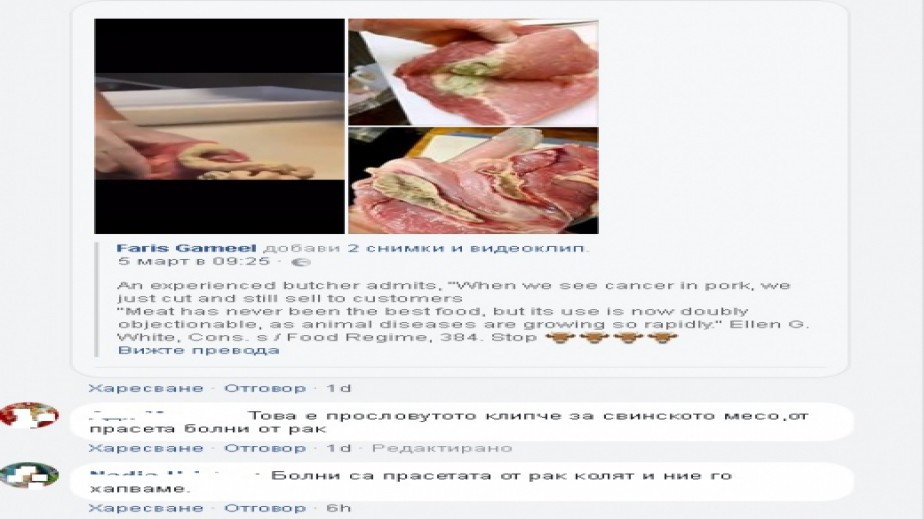 Оказва се, че подобно месо се продава и в България. Отново във Фейсбук жена споделя снимка, на която се вижда същата зеленикава гной, изтичаща от свинско месо. Тя обяснява, че го е закупила от голяма верига хипермаркети. От опаковката става ясно, че въпросното месо е в срок на годност. В коментарите под публикацията и други жени разказват, че са се натъкнали на подобен, гнусен продукт. И отново се припомня, че вероятно се касае за месо от животни, болни от рак.