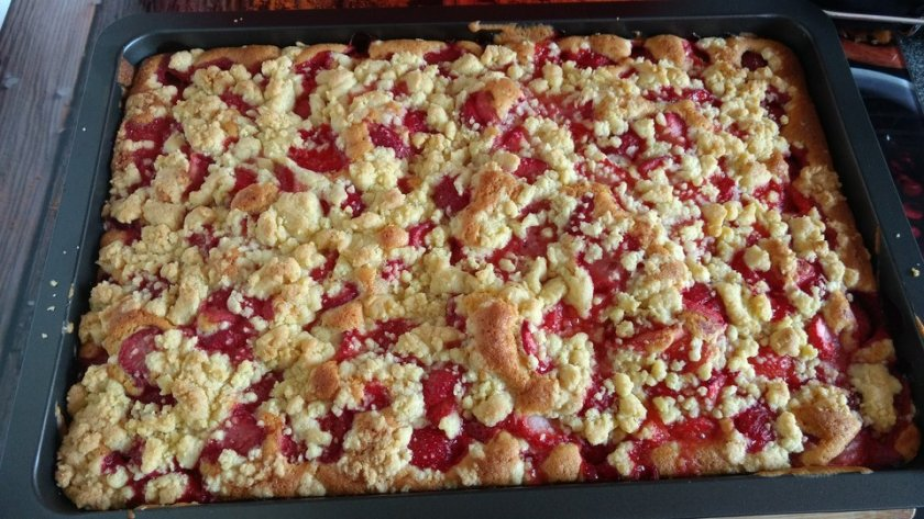 Останалото масло се омесва с останалите брашно, захар и ванилова захар. Настъргва се едро върху ягодите.