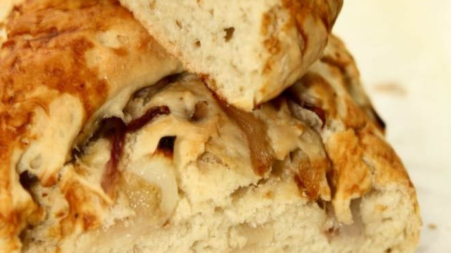 От посочените продукти се замесва тесто, разточва се на лист и се слага в намазана с масло форма за торта. Сланината се нарязва на парченца и се пуска за 2 минути във вряла вода. Лукът се нарязва на ситно, запържва се в маслото, прибавя се брашното и се разрежда с разбитата в млякото сметана. Сваля се от огъня и се прибавят яйцата, сол и черен пипер. Тази смес се изсипва върху тестото, отгоре се слагат парченцата сланина и парченца масло. Тортата се пече в гореща фурна 25-30 мин. и се сервира гореща.