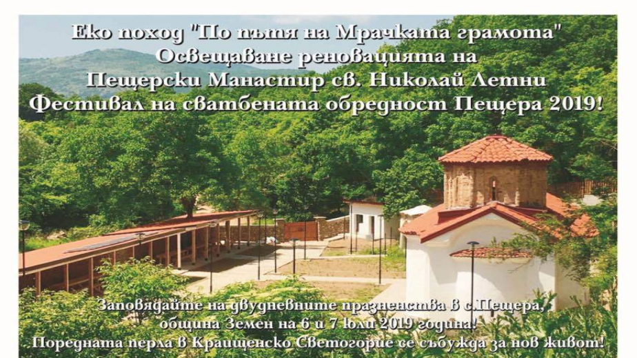 Началото на екопохода „По стъпките на Мрачката грамота“ е в 9,30 ч. Желаещите да участват в него ще тръгнат от с. Пещера и след преход от около 45 мин. ще пристигнат при манастира „Свети Николай летни“. в 10,30 ч. там ще има водосвет за реновацията на храма, който ще бъде отслужен от негово преосвещенство белоградчишкия епископ Поликарп, викарий на Софийския митрополит. В 12 ч. на обяд пък ще бъде раздаден курбан.