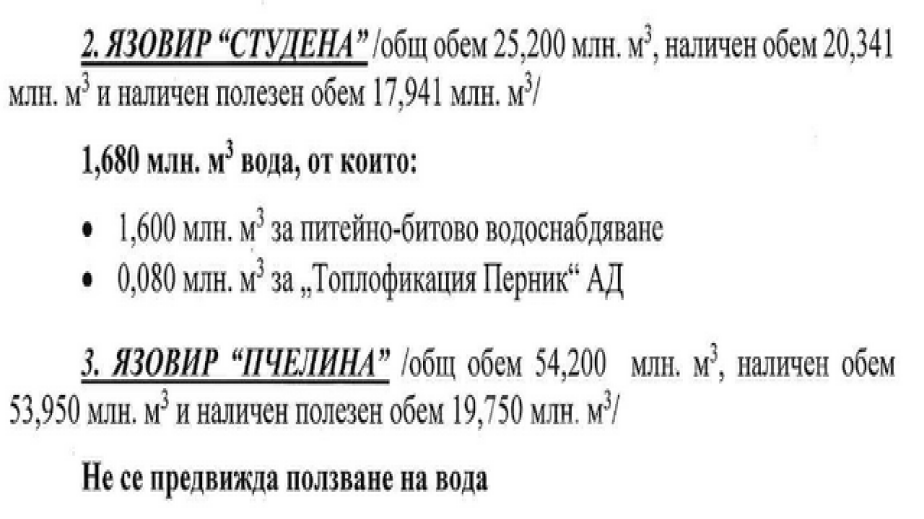 От утвърдения график е видно, че министър Димитров е разрешил ползването на вода на „Топлофикация“ Перник в размер на 0.080 млн.куб.м.