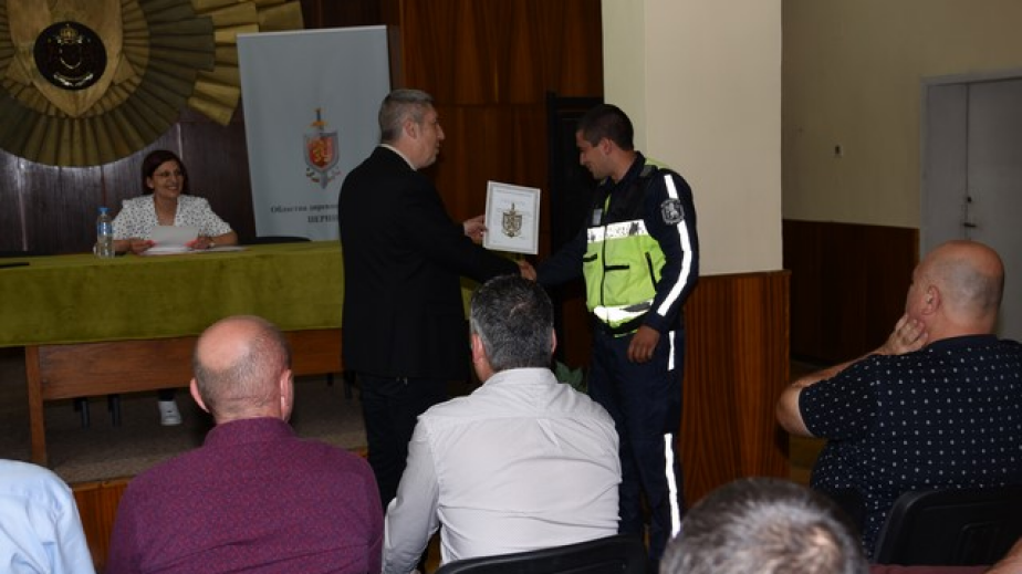 На тържествено събрание днес по повод 5 юли – професионалния празник на служителите на МВР бяха връчени наградите на полицаи от пернишката дирекция. Отличията са за постигнат съществен и колективен принос при изпълнение на служебните задължения, изразяващ се в проявен висок професионализъм, осъществени трайни професионални резултати при ежедневните служебни мероприятия, активна дейност за превенция и пресичане на престъпления, с цел издигане доверието към Министерството на вътрешните работи.