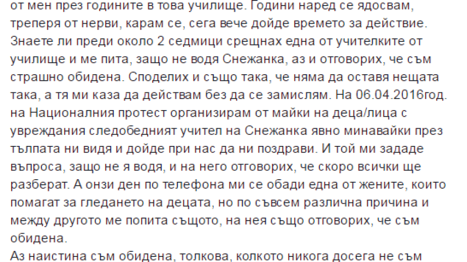 След въпросната случка с бележката Анна спира изцяло посещенията на Снежанка в училището и започва да си търси правата. Вече около 4 месеца тя води битка със системата в „Луи Брайл“, за което твърди, че изобщо не се грижи добре за децата.