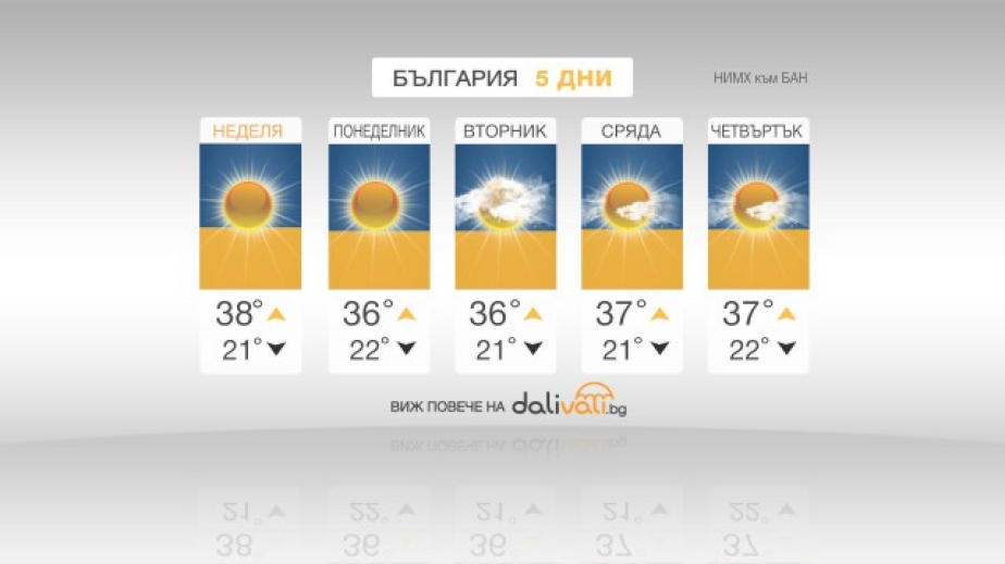 И през по-голямата част от следващата седмица времето ще се задържи слънчево и горещо с максимални температури на места в низините около 38°- 40°. Вятърът ще е слаб, на морския бряг - до умерен, от североизток.