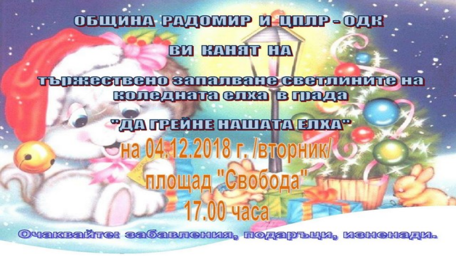 Тържественото запалване на светлините на коледното дръвче и украсата в центъра на града е традиция от няколко години. Организатори на мероприятието са Община Радомир и ЦПЛР – ОДК.Те са подготвили много изненади за малки и големи.