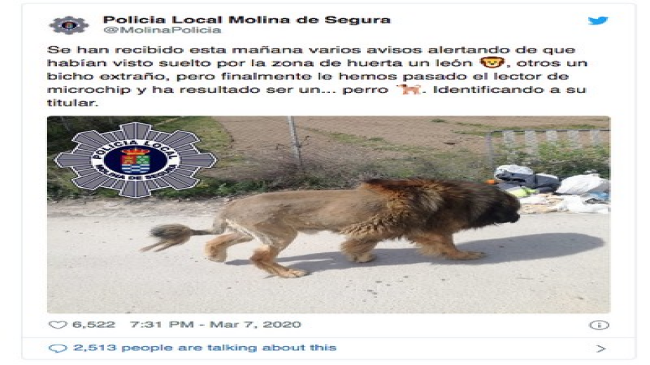 От пресцентъра на местната полицията споделиха в ''Туитър'' снимка на ''лъва'', уточнявайки, че собственикът на изгубеното куче е установен./Източник: Новини.бг