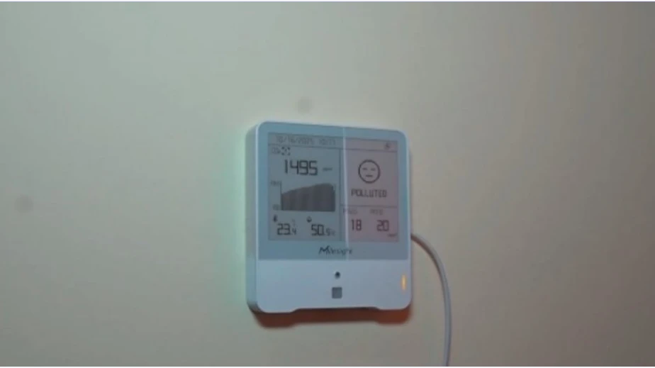 „В момента виждаме как човечето е сърдито и стойностите са над 1000 и индикаторът е оранжев, което означава, че има нужда от проветряване в класната стая, за да влезе чист въздух”, обяснява Валентина Делчева, директор на ПМГ „Иван Вазов”.