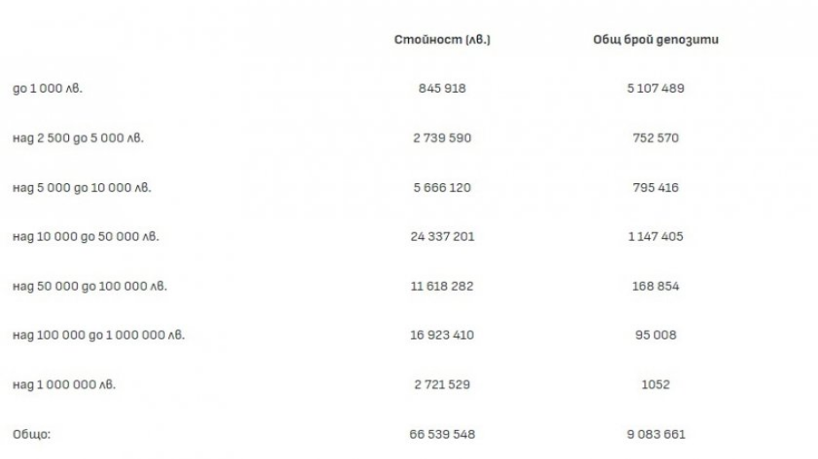 Броят на депозитите над 100 000 лв. е общо 90 060 или 1,06 процента от целия брой депозити. Това е нормално. Все пак едва ли са много хората, които могат да заделят толкова пари на влог. Обръщаме внимание, че общата стойност на тези депозити е 19,6 млрд. лв.