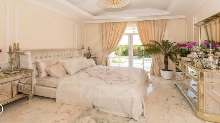 Къщата разполага с две двойни спални с обща баня. Тя е обзаведена изключително елегантно с изцяло индивидуално изработени мебели. В интериора са използвани луксозни естествени материали, естествен мрамор "Rosso portogalo" и дърво. Дневната и родителската спалня са обърнати към вътрешната градина на къщата и басейна.