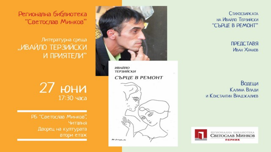 Поетът Ивайло Терзийски ще представи новата си стихосбирка "Сърце в ремонт". В библиотеката в Перник поетът ще се срещне с много свои приятели, затова премиерата е наречена "Ивайло Терзийски и приятели". Поетичната книга ще бъде представена от литературният критик Иван Хранов, а водещи ще бъдат Калина Влади и Константин Враджалиев.