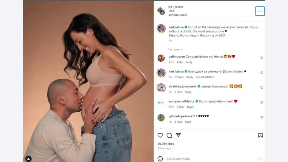 Ивет Лалова е бременна. Новината разкри самата тя в профила си в Инстраграм, казчвайки снимка на наедрялото си коремче. На фотосът, заснет професионално, се вижда и нейният съпруг Симоне Колио, който я целува именно там. Топ лекоатлетката е бременна в петия месец.