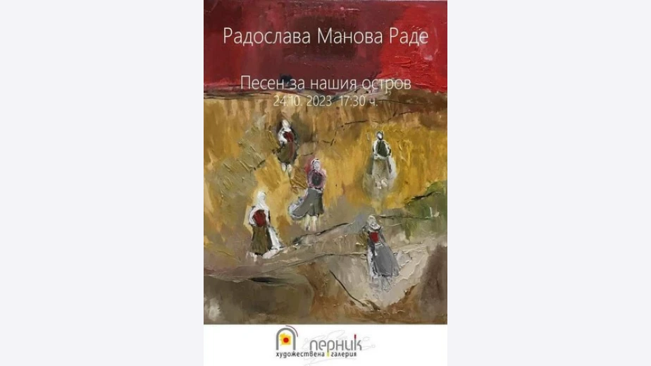 Изложбата "Песен за нашия остров" на перничанката Радослава Манова - Раде ще бъде открита във вторник, 24 октомври, съобщи авторката във фейсбук страницата си. Експозицията е подредена в Художествена галерия - Перник.