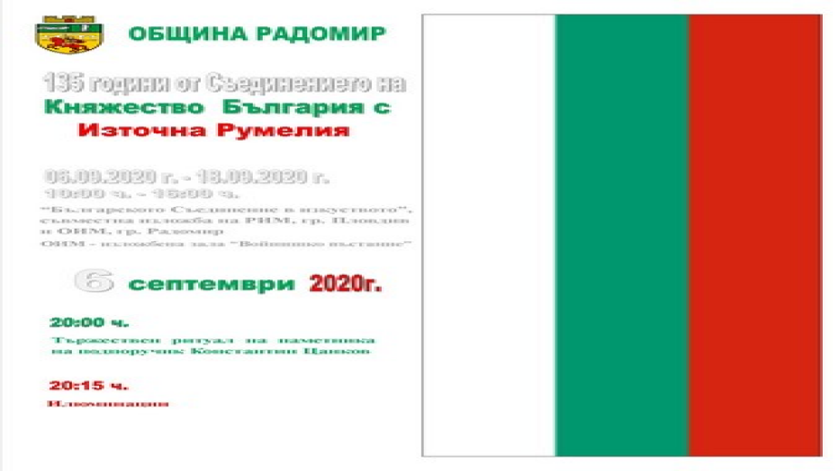 Празничната програма в Радомир по случай 6 септември – Съединението на България с Княжество Източна Румелия, ще започне в 10:00 часа с откриването на изложба, озаглавена "Българското Съединение в изкуството". Експозицията е съвместна инициатива на Регионален исторически музей – Пловдив и Общински исторически музей – Радомир. Тя може да бъде видяна от 10:00 до 16:00 ч. на 6 септември в Общински исторически музей - Радомир.