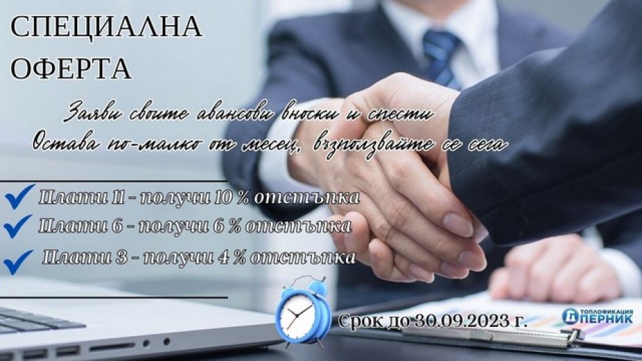 Изтича срокът за заявяване на новите условия към „Топлофикаци Перник“. До края на 30 септември топлинното дружество предлага на своите абонати специални нови отстъпки за потребителите.