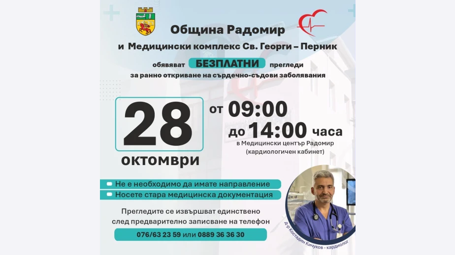Прегледите ще се извършват от д-р Костадин Кичуков – кардиолог на 28 октомври от 09:00 до 14:00 часа в Медицински център Радомир (кардиологичен кабинет).
