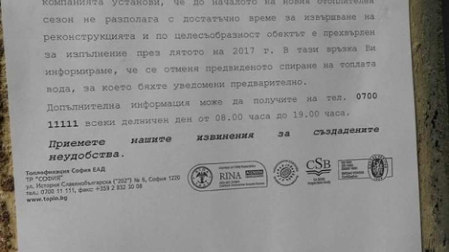 Зад Министерски съвет. Един ремонт, който не е влязъл и все още го няма в плановите ремонти на монополиста. Един ремонт, който не беше отбелязан в интернет страницата на Топлофикация. Но, хората в района получиха писмо, как от 8 до 30 септември ще останат без топла вода. Явно, Топлофикация познава само част от членовете в закона - да уведоми хората за ремонта 2 седмици по-рано.