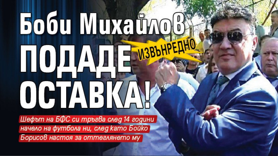 Президентът на футболния съюз Боби Михайлов е подал оставката си, съобщи сайтът на БФС. Това се случи, след като по-рано днес министър-председателят поиска бившия вратар да напусне шефското кресло във футболния съюз заради позорната загуба с 0:6 от Англия и титаничния расистки скандал на трибуните на стадион „Васил Левски”, предизвикан от български фенове, издаващи маймунски звуци. Борисов обяви, че се извършва финансова ревизия на Българския футболен съюз и че е разпоредил на спортния министър Красен Кралев да прекрати всякакви отношения с БФС, включително и финансови, до оттеглянето на Борислав Михайлов от поста.