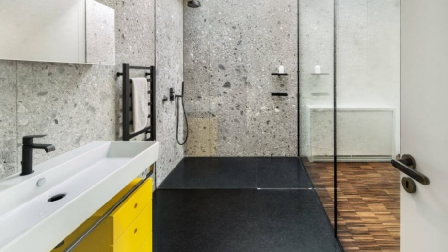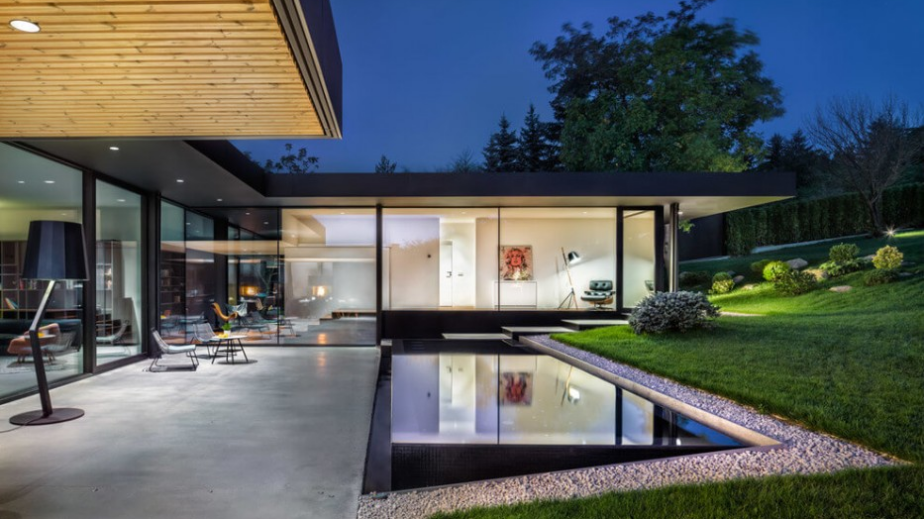 Основното ниво побира жилищните площи - дневна, трапезария, кухня и детски кът, както и три спални и две бани. Частично вградено в планински склон, по-ниското ниво на модерния дом се състои от сервизни помещения.