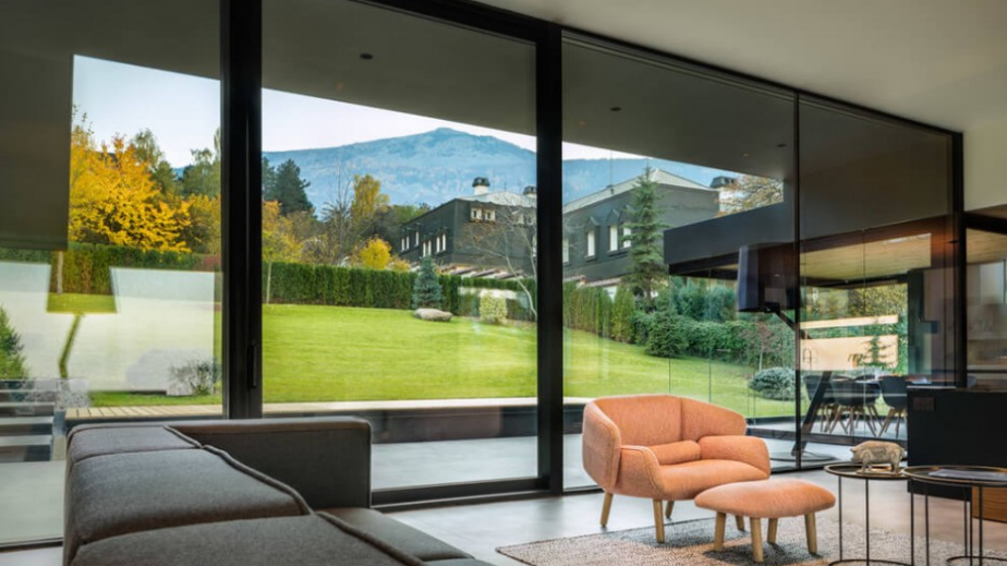 Еднофамилното жилище е кацнало на хълм, който предлага панорамна гледка към града от една страна и планини, от друга, пише "Струма бг".
