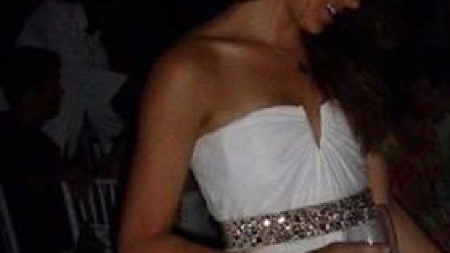 Тя е с пусната небрежно коса и дълга бяла рокля без презрамки и V-образно деколте. Акцент на тоалета придава сребърен колан около талията ѝ.