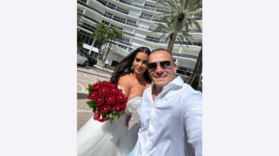 Преди около седмица бившата жена на певеца от екипа на Слави Трифонов съобщи, че е сгодена за друг, а преди дни се похвали, че вече е омъжена. „И ей така... решихме да се оженим", сподели брюнетката в социалните мрежи и изненада всичките си последователи. Булката е облечена с красива бяла рокля с широко отворено деколте, което демонстрира пищната й естествена гръд. На главата си има було, а букетът е класика - от червени рози с малки перли по тях. Младоженецът пък е заложил на бяла риза, светлосин панталон и колан на скъпа модна марка, който демонстрира финансовото му благополучие.