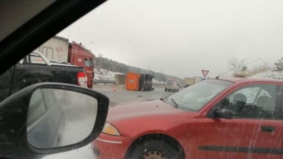 Временно движението при км 31 на АМ "Струма" в посока София в района на пътен възел Боснек се осъществява в аварийна лента поради ПТП. Шофьорите да се движат с повишено внимание и съобразена скорост. Трафикът се регулира от "Пътна полиция", съобщиха от АПИ. Малко преди 10 ч. днес близо до катастрофата с македонския автобус, при който изгоряха 45 души, се е обърнал камион. Той е бил натоварен с пясък, шофьорът е бил затиснат в кабината, но по- късно е изваден. Транспортиран е в болница без опасност за живота.