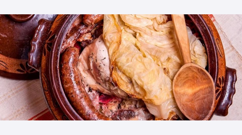 На дъното на голям глинен гювеч слагате 2-3 лентични сланина, а върху тях половината от останалите цели зелеви листа. Отгоре слагате ред ситно нарязано кисело зеле, ½ от кубчетата червено цвекло, ½ от ориза и поръсвате с половината от подправките. Нареждате няколко лентични сланина, ½ от месото и ½ от суровата наденица, а в средата и ½ пиле.