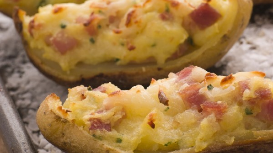 Измийте добре необелените картофите и ги изпечете във фурната, завити във фолио. Извадете, обелете и ги издълбайте в средата.Към издълбаното прибавете ситно нарязаната шунка, майонезата, смлените чесън и маслините.Напълнете картофите с тази плънка и запечете за 10-тина минути.
