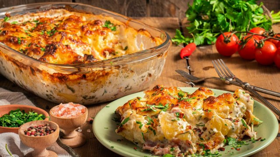 Обелете и нарежете на кубчета сварените картофи, посолете и ги сложете в тава.