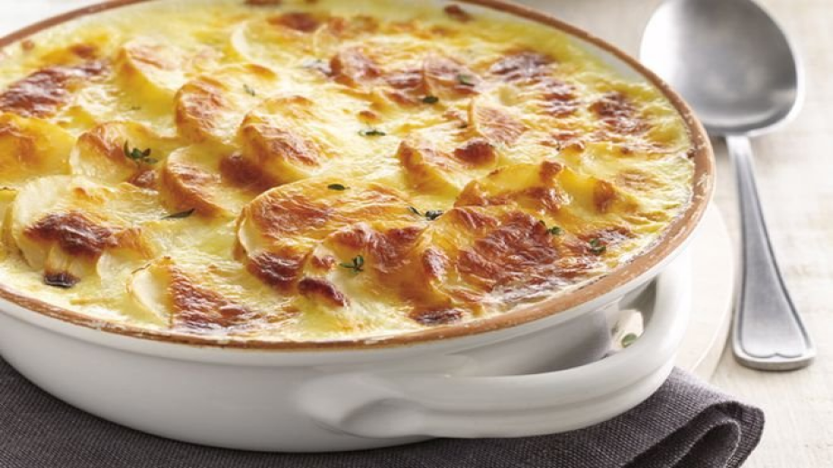 Картофите се обелват внимателно, измиват се и се слагат за варене в подсолна вода. Лука нарязва на филийки. Взема се тиган, слага се 50 мл олио и се включва котлона за загряване. В тигана се изсипва нарязания лук, добавя се 3 с.л. вода и се слага на котлона да се задуши за 10 минути. Картофите се проверяват с вилица, не трябва да са съвсем разварени като за пюре (обикновено 20- 30 минути са достатъчни). Оттеглят се от котлона, излива се водата и се оставят настрани за да изстинат. След като лукът е вече задушен се взема една тавичка. Дъното на тавичката и оклния ръб се намазват с олио. Вземат се картофите един по един, нарязват се на колела с дебелина половин сантиметър. На дъното на тавичката се зареждат картофи, след което върху тях се посипва половината от задушения лук. Огоре се поръсва сол и индиско орехче. След това се подрежда втори ред картофи. Върху него се разпределя останалия лук и отновосе поръсва сол и ндийско орехче. Завършва се с ред картофи. Отгоре се полива с пясно мляко и се наръсва с кашкавал. Най отгоре се слагат тук- там парченца краве масло. Пече се на 200 градуса, около 20 минути